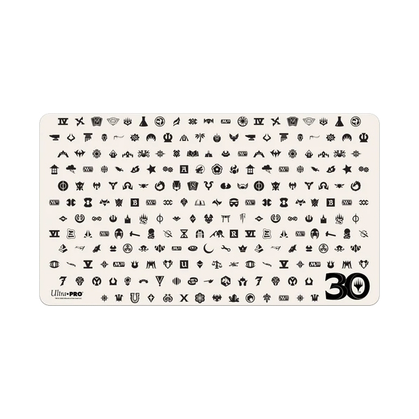 Holofoil Playmat featuring popular Magic: The Gathering expansion symbols from the past 30 years of the trading card game on a shiny holofoil printed material. Made with a soft fabric top to reduce damage to cards during play and a non-slip rubber backing to keep the playmat from shifting during use, playmats enhance the gameplay experience. With dimensions of approximately 24 in. x 13.5 in., a playmat also makes an excellent oversize mousepad for home or office.