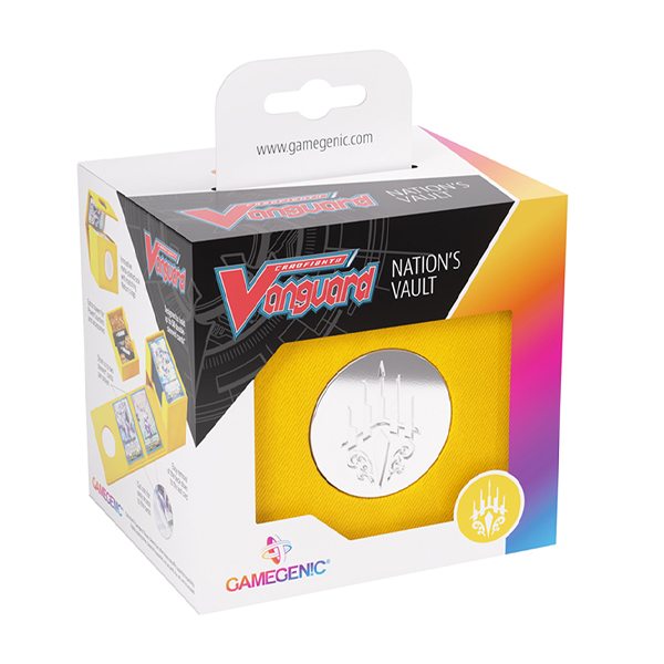 Coming in 6 different colors, all six different nations are represented with their matching color and the innovative metal-plated lock with the nation’s symbol at the front. The Cardfight!! Vanguard Nation’s Vault is perfectly sized to hold a full deck of up to 50 cards, even double-sleeved. In addition, there are 2 protected pockets to present and safely store up to 4 special sleeved cards.